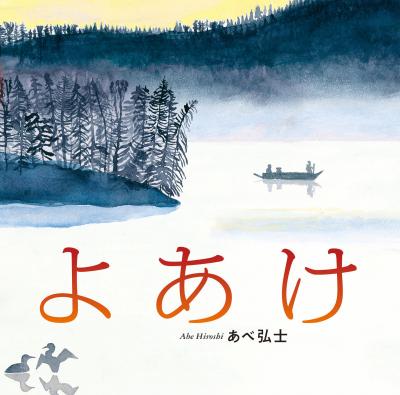 山に囲まれた湖のほとり、まだ暗くて静かな夜明け前。おじいさんと孫が眠っています。沈みかけた月が湖面にうつっています。やがて水面にもやが立ち、カエルのとびこむ音、鳥が鳴きかわす声が聞こえるようになると、おじいさんは孫を起こします。